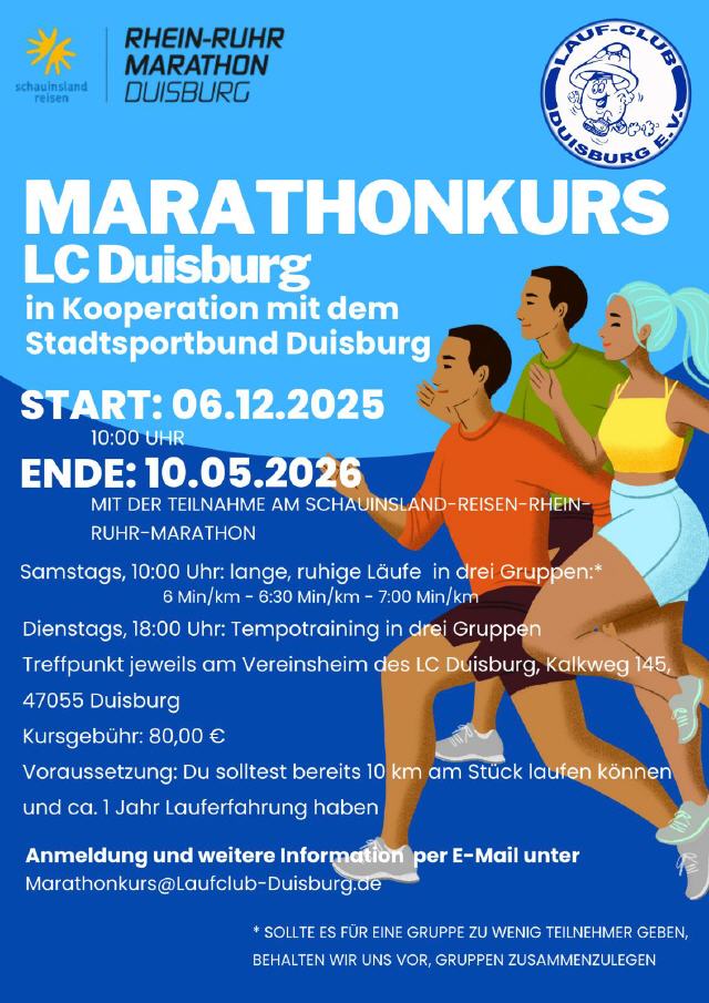 Der LC Duisburg bietet als Vorbereitung zum 43. schauinsland-Reisen-Marathon wieder einen Marathon-Kurs an. Am 6. Dezember 2025 startet am Vereinsheim die erste Einstimmung für den Lauf quer durch Duisburg. In bewährter Manier eignet sich der Marathon-Kurs sowohl für Erst-Marathonis als auch für Routiniers, die sich in der Gemeinschaft auf den Traditionslauf vorbereiten wollen. Ziel ist das Finish am 10. Mai 2026 in der schauinsland-reisen-arena. Geplant sind mehrere nach Tempo unterteilte Gruppen. Konkrete Informationen gibt es in den nächsten Wochen über die Medienkanäle des LC, insbesondere auf der Homepage. Für LC-Mitglieder ist die Teilnahme am Marathon-Kurs kostenfrei.