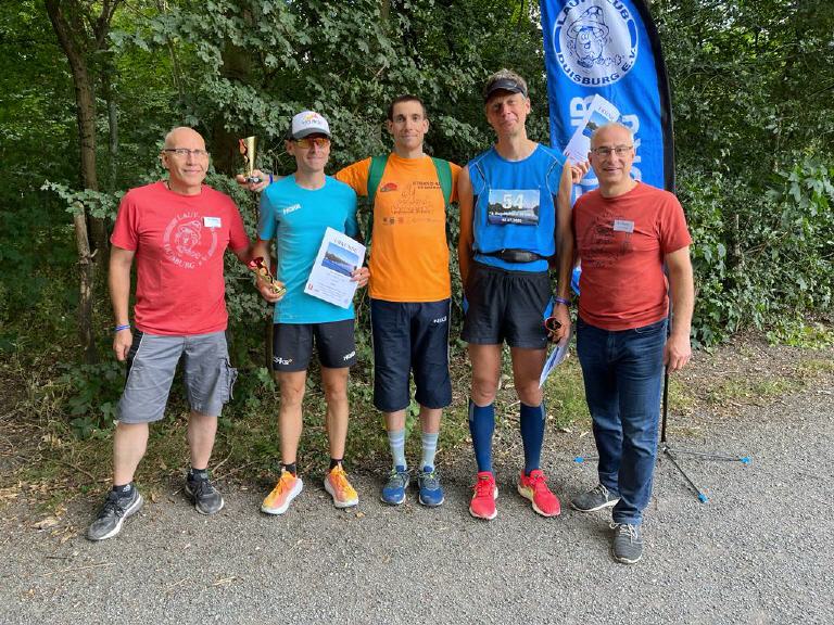 Regattabahn-Ultra03-Sieger: Champions beim Regattabahn 50 in 2022 (v.l.): Henning Schmitz (Orgateam LC Duisburg), Stijn van Lokeren (2. Platz), Wouter Decock (Sieger in 3:08:52 Std.), Tobi Duncker (3. Platz), Dirk Görtz (Orgateam LC Duisburg)