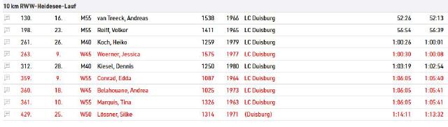 Beim 10 km Lauf liess sich Andreas van Treek nicht die Butter vom Brot nehmen. Volker Reiff wollte nach "Frankfurt" nur auslaufen. Deutlich spannender wurde es jedoch auf den Plätzen 359 bis 361, ein Photofinish von Edda Conrad, Andrea Belahounae und Tina Marquis. Edda war um ein Wimpernschlag vorne.