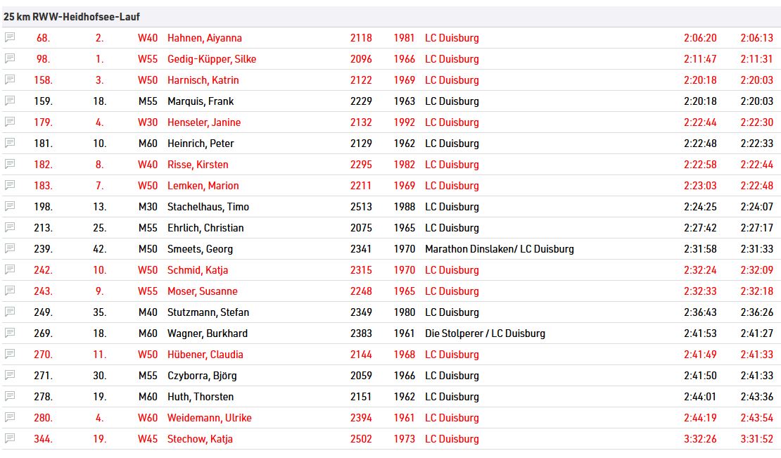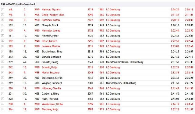 Beim 25 km Lauf zog Aiyanna Hahnen mit dem Start sofort davon, kein LC'ler konnte ihr folgen. Peter Heinrich riskierte alles und startete mit einem hohen Anfangstempo, versuchte sich dann ab km 5 an Silke Gedig zu hängen, was bis km 12 auch gut klappte. Silke hatte jedoch ein phantatisches Rennen und sie drehte weiter auf, so das sich der Abstand in der Folge immer weiter vergrößerte. Bis km 21 sah es noch so aus, das Peter die 2:20h unterbieten könnte, wurde jedoch deutlich langsamer und bei km 23 von Kartin Harnisch und Frank Marquis gestellt. Schliesslich musste er noch Janine Henseler knapp 20 m vor dem Ziel den Vortritt lassen. Kirsten Risse und Marion Lemken wären 100 m später an ihm vorbei geflogen, die Zielmatte rettete ihn.