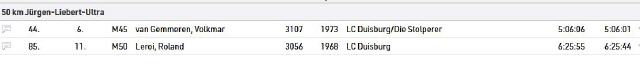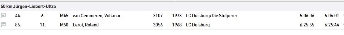 Beim 50 km Lauf waren zwei LC'ler vertreten: Volkmar van Gemmeren konnte sich nach 5:06 die Medalie umhängen, Roland Leroi erst nach 6:25:55 h min.
