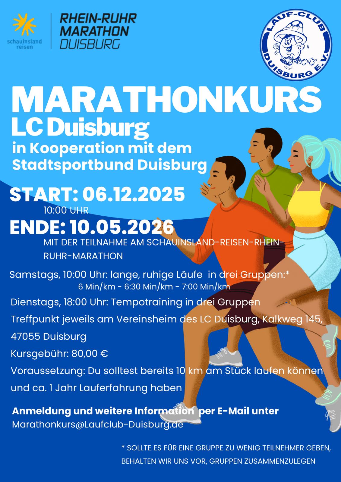 Der LC Duisburg bietet als Vorbereitung zum 43. schauinsland-Reisen-Marathon wieder einen Marathon-Kurs an. Am 6. Dezember 2025 startet am Vereinsheim die erste Einstimmung für den Lauf quer durch Duisburg. In bewährter Manier eignet sich der Marathon-Kurs sowohl für Erst-Marathonis als auch für Routiniers, die sich in der Gemeinschaft auf den Traditionslauf vorbereiten wollen. Ziel ist das Finish am 10. Mai 2026 in der schauinsland-reisen-arena. Geplant sind mehrere nach Tempo unterteilte Gruppen. Konkrete Informationen gibt es in den nächsten Wochen über die Medienkanäle des LC, insbesondere auf der Homepage. Für LC-Mitglieder ist die Teilnahme am Marathon-Kurs kostenfrei.
