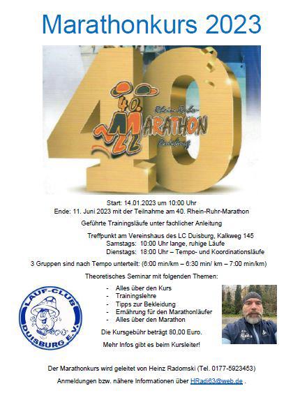 Der LC Duisburg bietet als Vorbereitung zum 43. schauinsland-Reisen-Marathon wieder einen Marathon-Kurs an. Am 6. Dezember 2025 startet am Vereinsheim die erste Einstimmung für den Lauf quer durch Duisburg. In bewährter Manier eignet sich der Marathon-Kurs sowohl für Erst-Marathonis als auch für Routiniers, die sich in der Gemeinschaft auf den Traditionslauf vorbereiten wollen. Ziel ist das Finish am 10. Mai 2026 in der schauinsland-reisen-arena. Geplant sind mehrere nach Tempo unterteilte Gruppen. Konkrete Informationen gibt es in den nächsten Wochen über die Medienkanäle des LC, insbesondere auf der Homepage. Für LC-Mitglieder ist die Teilnahme am Marathon-Kurs kostenfrei.